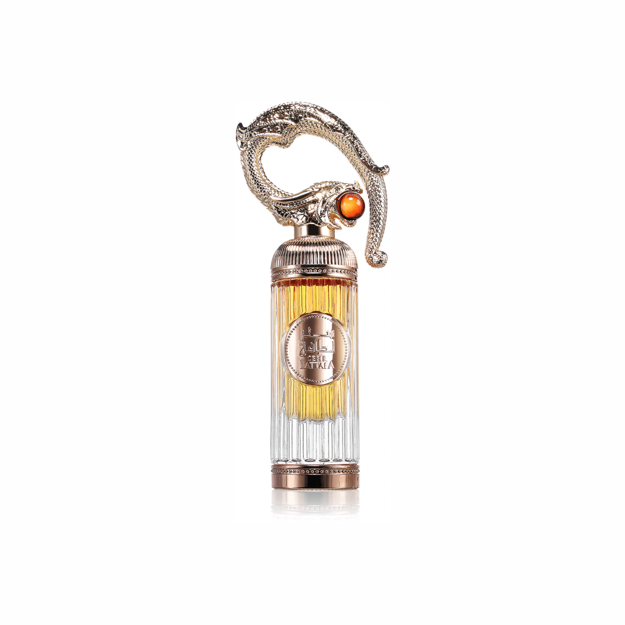 Le flacon deSehr Lattafa capte immédiatement l’attention grâce à son design somptueux et raffiné. Le bouchon, orné d’un animal majestueux tenant une perle rouge entre ses mâchoires, symbolise puissance et mystère, ajoutant ainsi une touche de luxe inégalée à votre collection.